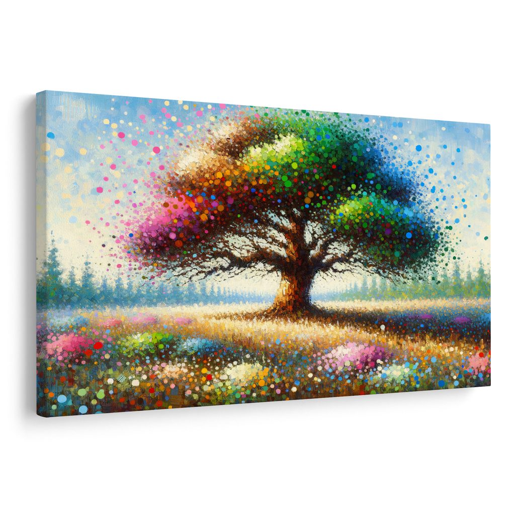 Das Wandbild "Lebensbaum im Farbenrausch" zeigt einen majestätischen Baum, umgeben von bunten Blumen und farbigen Punkten. Details wie das üppige Laub und die lebhaften Blumen schaffen eine harmonische Komposition, die den Raum erfrischt. Intensive Farben wie Grün, Blau, Rot und Gelb verleihen dem Bild eine fröhliche und lebendige Atmosphäre. Dieses Wandbild ist ideal, um jedes Interieur zu beleben, vom Wohnzimmer bis zum Arbeitszimmer. Es ist aus hochwertiger Leinwand gefertigt, die Langlebigkeit und Farbtreue garantiert.