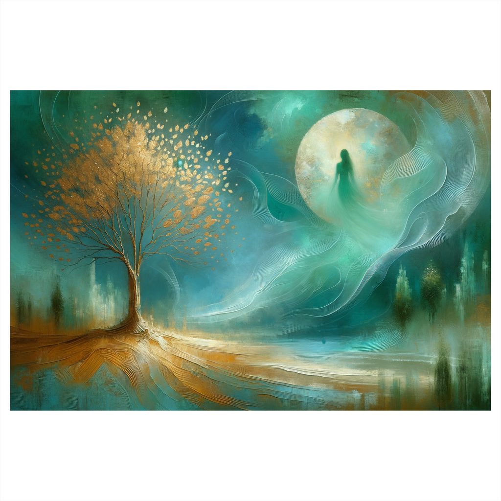 Das Wandbild des Lebensbaums im Mondlicht bringt eine magische Atmosphäre in Ihren Raum. Der dominante goldene Baum mit glänzenden Blättern kontrastiert mit den sanften blau-grünen Tönen des Hintergrunds und schafft ein harmonisches Gesamtbild. Das Mondlicht und die filigrane Gestalt verleihen der gesamten Komposition einen Hauch von Geheimnis und Ruhe. Dieses Wandbild eignet sich hervorragend für das Wohnzimmer oder Schlafzimmer, wo es Entspannung und Wohlbefinden fördert. Der hochwertige Druck auf Leinwand sorgt für Langlebigkeit und lebendige Farben.