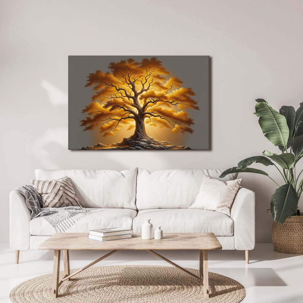 Das Wandbild des strahlenden Lebensbaums bringt eine einzigartige Energie in Ihren Raum. Die Details der goldenen Blätter und des starken Stammes strahlen Harmonie und die Kraft der Natur aus. Warme Gelb- und Orangetöne schaffen eine gemütliche und positive Atmosphäre. Dieses Motiv eignet sich perfekt als Blickfang im Wohnzimmer oder im Büro. Das Wandbild ist auf hochwertiger Leinwand gedruckt, die Langlebigkeit und Farbintensität garantiert.