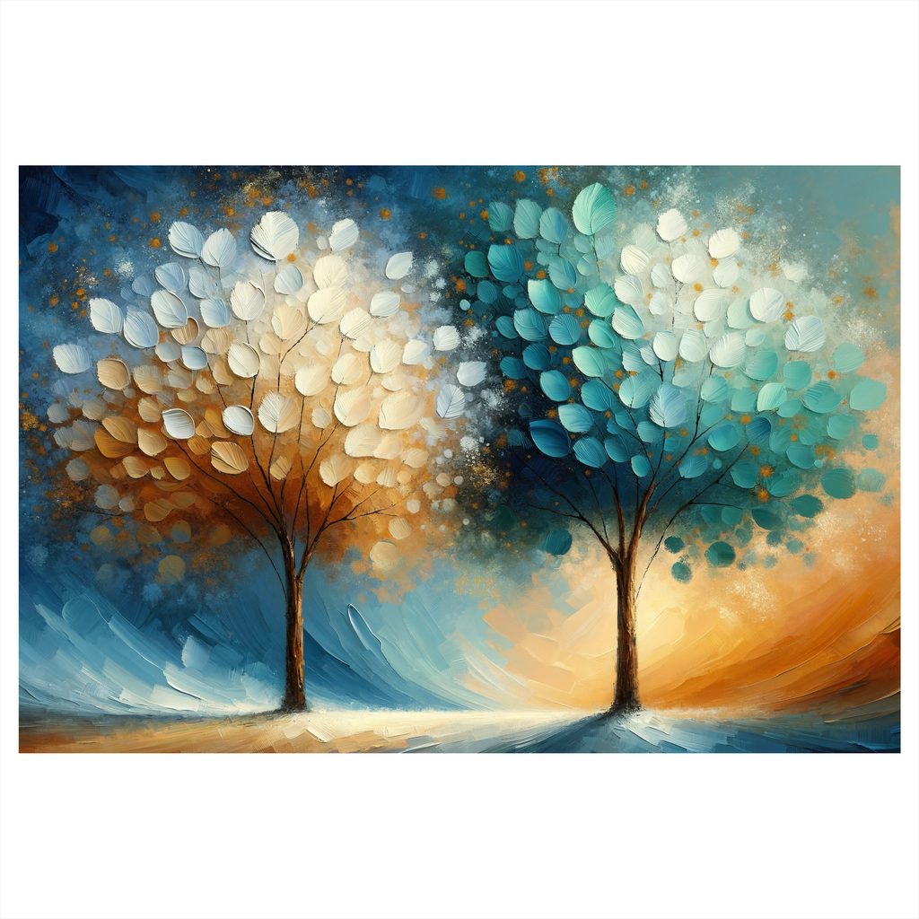Das Wandbild zeigt zwei Lebensbäume, die Harmonie und Verbindung symbolisieren. Der eine Baum ist in warmen Brauntönen und Gold gehalten, der andere in kühlen Blau- und Grüntönen. Die Farbkombination schafft eine beruhigende Atmosphäre, die Ruhe und Wohlbefinden in den Raum bringt. Dieses Motiv ist ideal für das Wohnzimmer oder das Arbeitszimmer, wo es Kreativität und positive Energie fördert. Das Bild ist auf hochwertiger Leinwand gedruckt, die Langlebigkeit und Farbintensität garantiert.