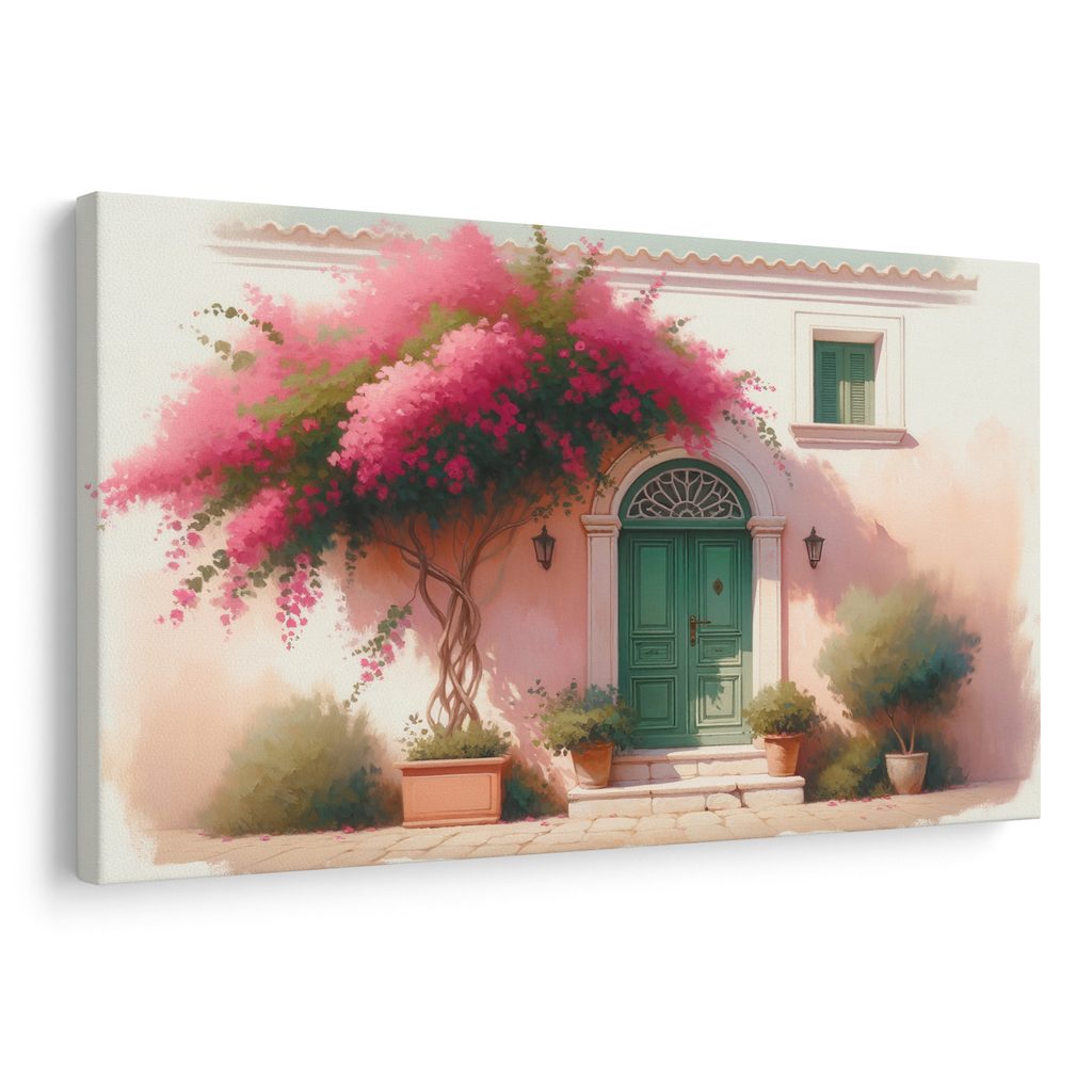 Romantischer Eingang mit üppiger Blumendekoration. Auf dem Wandbild dominieren grüne Türen, umgeben von wunderschönen rosa Blüten und grünen Pflanzen. Sanfte Pastellfarben schaffen eine ruhige und gemütliche Atmosphäre, ideal für Ihr Zuhause. Dieses Wandbild ergänzt perfekt das Interieur Ihres Wohnzimmers oder Schlafzimmers und verleiht ihm einen Hauch von Eleganz. Die hohe Druckqualität garantiert Langlebigkeit und Farbintensität.