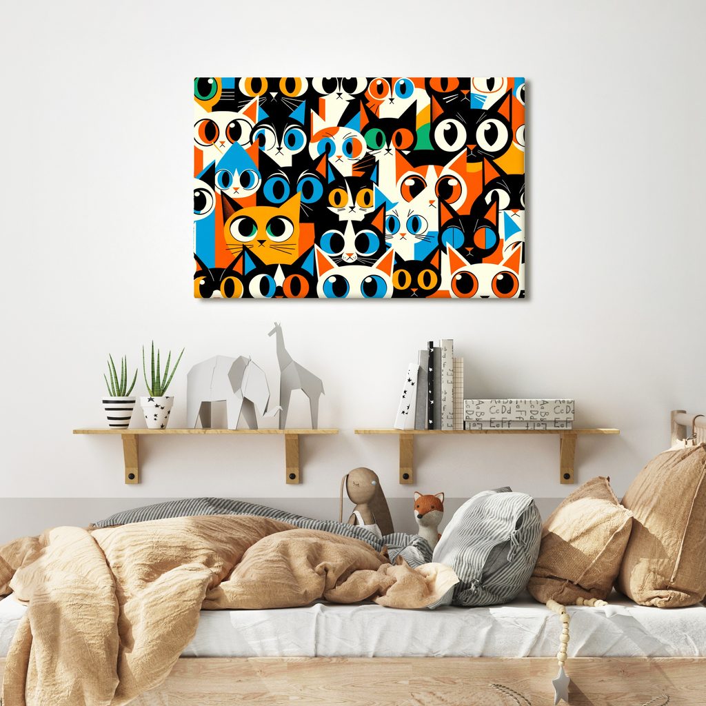 Das Wandbild fängt eine verspielte Komposition von bunten Katzen im abstrakten Stil ein. Jede Katze hat ausdrucksstarke Augen und einzigartige Farben, was eine lebendige und energetische Atmosphäre schafft. Dominante satte Töne von Schwarz, Weiß, Orange, Blau und Grün harmonieren perfekt miteinander. Dieses originelle Motiv ist ideal, um jeden Innenraum aufzufrischen und erfreut Katzenliebhaber. Der hochwertige Druck auf Leinwand garantiert Langlebigkeit und wunderschöne Farben.