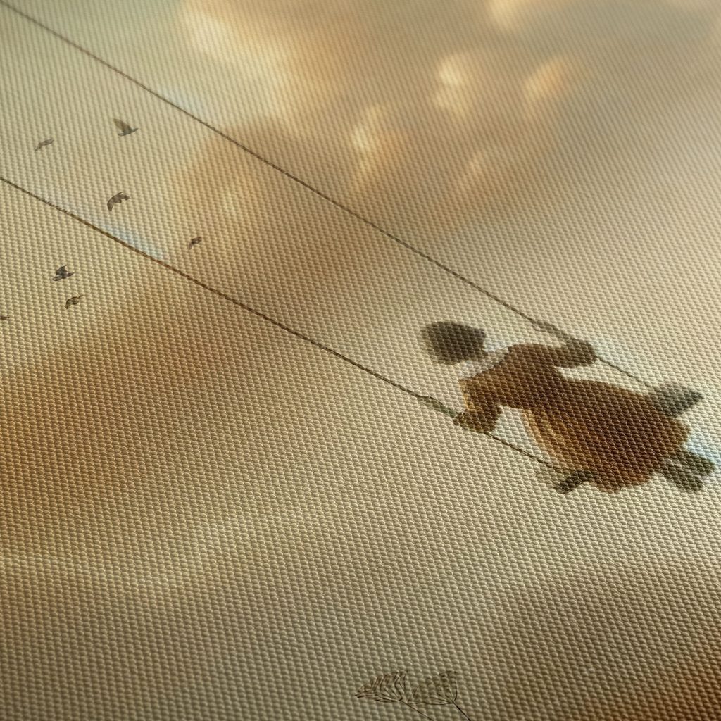 Auf dem Wandbild ist ein Mädchen auf einer Schaukel zu sehen, das über eine zauberhafte Landschaft schwebt. Im Hintergrund entfaltet sich ein dramatischer Himmel mit sanften Wolken und fliegenden Vögeln, was der Szene einen märchenhaften Touch verleiht. Warme Brauntöne und goldene Akzente schaffen eine ruhige und nostalgische Atmosphäre. Dieses Bild ist ideal, um das Kinderzimmer aufzufrischen oder als inspirierendes Element im Wohnraum zu dienen. Hergestellt aus hochwertigen Materialien, garantiert es Langlebigkeit und einfache Pflege.