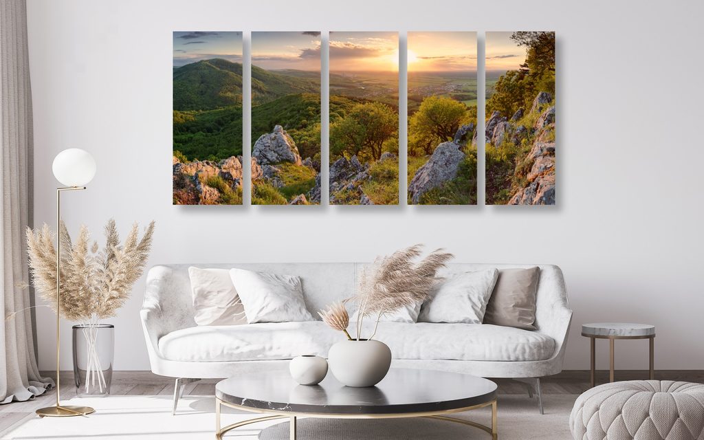 Dieses 5-teiliges Wandbild fängt die wunderschöne, sonnendurchflutete Natur ein. Auf dem Bild sind grüne Hügel, felsige Formationen und Bäume abgebildet, die eine harmonische Landschaft schaffen. Die Farbpalette in Grüntönen und goldenen Akzenten verleiht dem Werk eine ruhige und erfrischende Atmosphäre. Ideal, um das Interieur Ihres Wohnzimmers oder Büros aufzufrischen. Der hochwertige Druck auf Leinwand garantiert eine lange Lebensdauer und lebendige Farben.