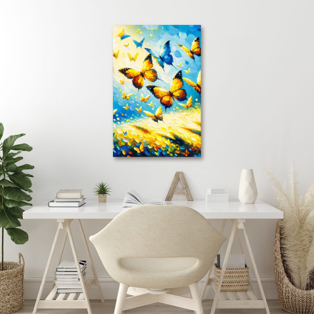 Das Wandbild mit goldenen Schmetterlingen am Himmel fängt die Schönheit der Natur und die Freiheit ein. Schmetterlinge in verschiedenen Größen und Schattierungen von Gelb und Blau schweben über einer blühenden Landschaft. Helle und lebendige Farben schaffen eine optimistische Atmosphäre und ein Gefühl der Freude. Dieses Wandbild ist ideal, um jeden Raum zu beleben, sei es im Wohnzimmer oder im Arbeitszimmer. Der hochwertige Druck auf Leinwand garantiert Langlebigkeit und Farbintensität.