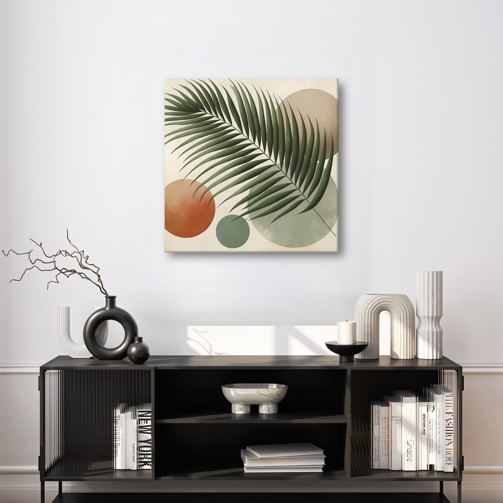 Das Wandbild mit dem Motiv eines tropischen Blattes in Kreisen bringt einen Hauch von Natur und Eleganz in Ihr Zuhause. Das dominante grüne Blatt ist vor einem Hintergrund mit sanften, kreisförmigen Formen in warmen und natürlichen Farben platziert. Die Kombination aus Grün, Braun und zartem Grau schafft eine beruhigende und harmonische Atmosphäre. Dieses Wandbild ist die perfekte Ergänzung für Ihr Wohnzimmer, Schlafzimmer oder Arbeitszimmer. Der qualitativ hochwertige Druck auf Leinwand garantiert Langlebigkeit und Farbtreue.