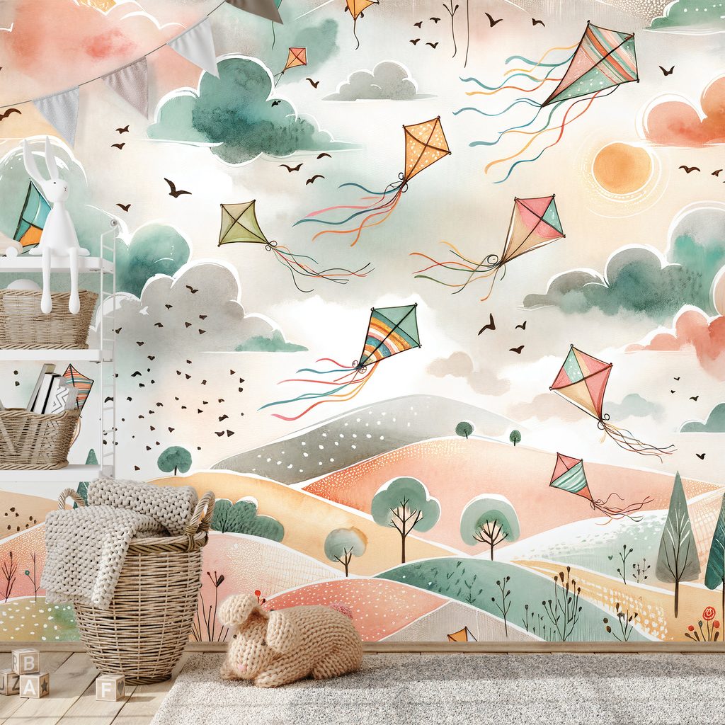 Selbstklebende Tapete mit dem Motiv von pastellfarbenen fliegenden Drachen am Himmel bringt eine verspielte Atmosphäre in Ihr Zuhause. Die luftigen Drachen in verschiedenen Farben schweben über einer malerischen Landschaft mit sanften Hügeln und Bäumen. Die Kombination aus pastelligen Tönen und feinen Details schafft eine beruhigende und positive Stimmung. Diese Tapete ist ideal für Kinderzimmer oder kreative Räume, in denen sie die Fantasie anregt. Das hochwertige Material sorgt für eine einfache Anwendung und eine lange Lebensdauer, sodass Sie die Schönheit dieses Motivs über lange Zeit genießen können.