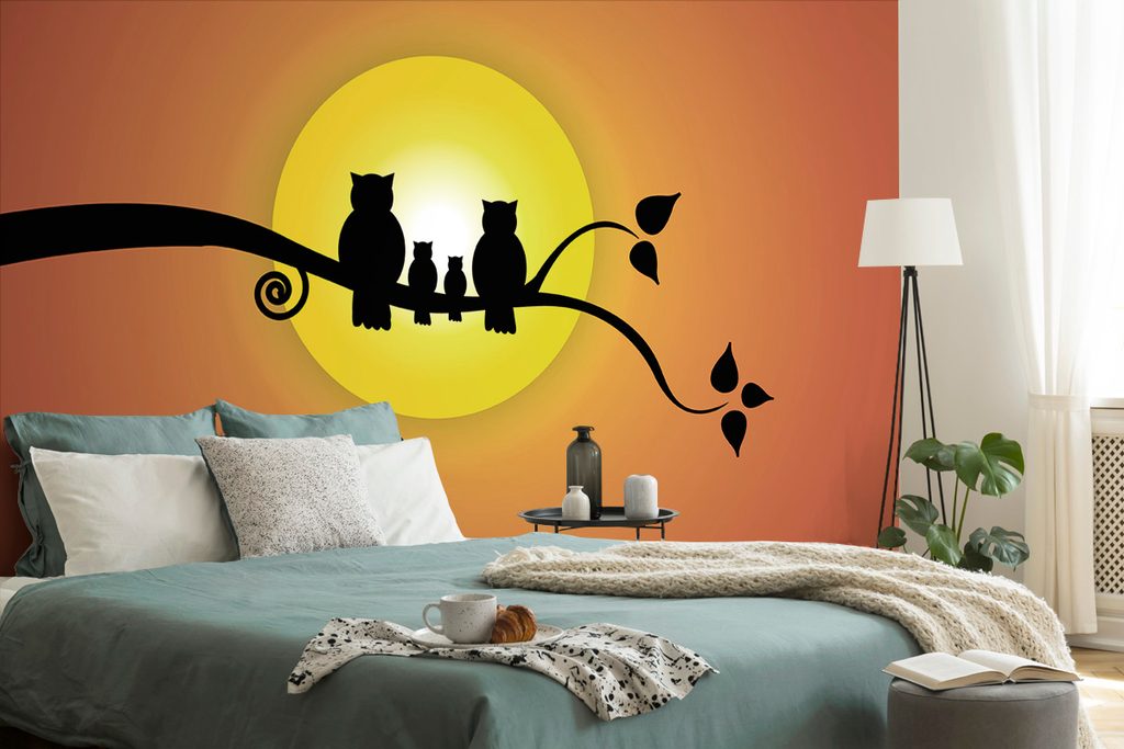 Die Tapete mit dem Motiv einer Eulenfamilie auf einem Baumast bringt eine verspielte Atmosphäre in Ihr Zuhause. Die Silhouetten der Eulen im Kontrast zur leuchtend gelben Sonne schaffen ein angenehmes und gemütliches Gefühl. Warme Orangetöne und Gelbnuancen verleihen dem Raum Energie und Freude. Eine ideale Wahl für das Kinderzimmer oder einen Bereich, in dem Sie Kreativität und Fantasie anregen möchten. Unsere Tapeten sind aus hochwertigen Materialien gefertigt, die Langlebigkeit und einfache Anwendung garantieren.