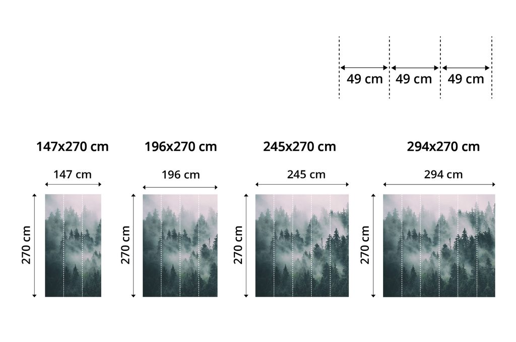 Bei Tapeten mit einer Höhe von 270 cm wird das Motiv an die jeweilige Größe angepasst, wodurch Teile des Motivs entfallen können. Nach dem Anklicken der gewünschten Größe auf der Website wird die exakte Darstellung der Tapete angezeigt. Die Größen bestehen aus 49 cm breiten Bahnen.