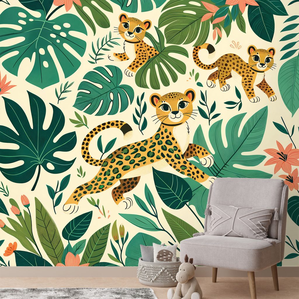Niedliche Leopardenbabys im Dschungel sind das Hauptmotiv dieser Tapete, die eine verspielte Atmosphäre in jedes Interieur bringt. Die Jungen bewegen sich zwischen dem üppigen Grün tropischer Blätter und bunten Blumen, was der Szenerie Lebhaftigkeit und Freude verleiht. Warme Gelb- und Grüntöne, ergänzt durch zarte Rosatöne, schaffen ein angenehmes und fröhliches Gefühl. Diese Tapete ist ideal für Kinderzimmer oder als originelles Element im Wohnbereich. Hochwertige Materialien garantieren Langlebigkeit und eine einfache Anbringung.