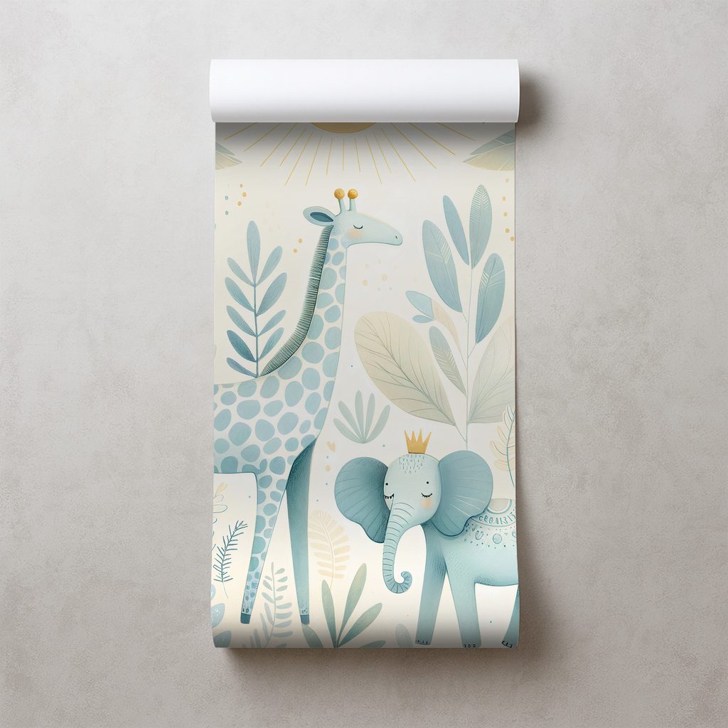 Niedliche Tapete mit einem Dschungeltiere-Motiv bringt eine verspielte Atmosphäre in Ihr Zuhause. Auf der Tapete sind eine Giraffe und ein Elefant zu sehen, umgeben von stilisierten Palmen und grünen Blättern, die dem gesamten Motiv Lebendigkeit verleihen. Sanfte Blau- und Gelbtöne dominieren und schaffen eine ruhige und angenehme Stimmung. Dieses Design ist ideal für Kinderzimmer oder Spielbereiche, wo es die Fantasie der Kinder anregt. Die Tapete besteht aus hochwertigem Material, das Langlebigkeit und einfache Anbringung garantiert.