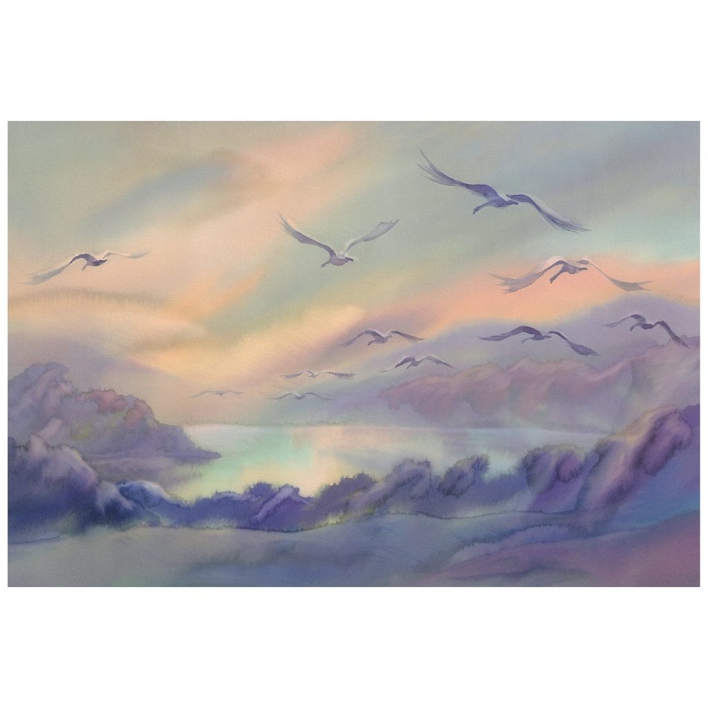 Selbstklebende Tapete mit dem Motiv von Vögeln, die über eine malerische Landschaft fliegen, bringt einen Hauch von Natur und Ruhe in Ihr Interieur. In den zart ausgearbeiteten Details sehen wir Vögel, die über blau-violette Berge und eine ruhige Wasseroberfläche fliegen, was ein Gefühl von Freiheit und Wohlbefinden hervorruft. Die Farbpalette in sanften Pastelltönen schafft eine harmonische Atmosphäre, die sich in jeden Raum einfügt. Diese Tapete ist ideal für Wohnzimmer, Schlafzimmer oder Büros, wo sie Kreativität und Entspannung fördert. Das hochwertige Material sorgt für eine einfache Anwendung und eine lange Lebensdauer des Produkts.