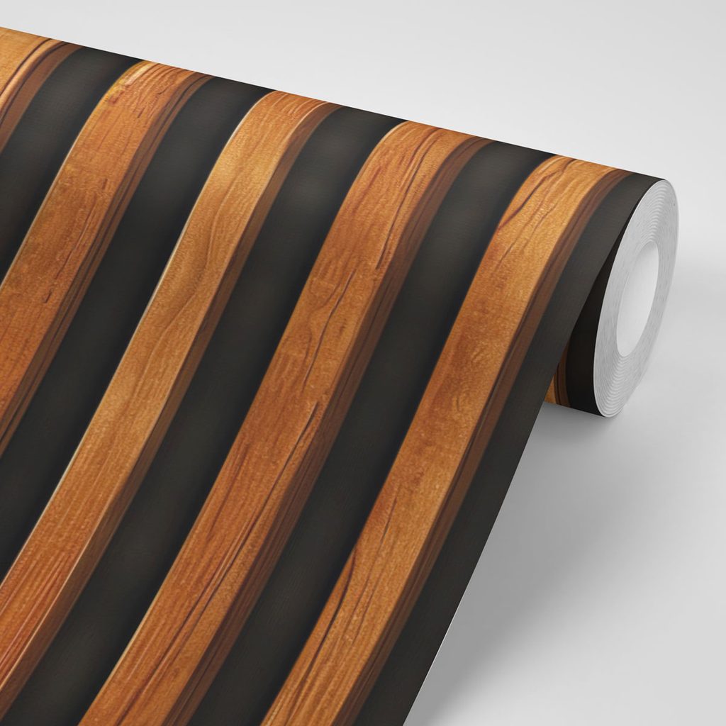 Selbstklebende Tapete mit einem Motiv aus Holzlamellen auf schwarzem Hintergrund bringt moderne Eleganz in Ihr Zuhause. Die Holzelemente in warmen Brauntönen kontrastieren mit dem dunklen Hintergrund und schaffen einen interessanten visuellen Effekt. Die Atmosphäre ist gemütlich und raffiniert, ideal für jeden Raum. Diese Tapete eignet sich hervorragend für Wohnräume, Büros oder Schlafzimmer. Das hochwertige Material garantiert eine einfache Anwendung und eine lange Lebensdauer.