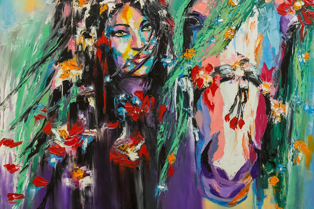 Die Selbstklebende Tapete fängt ein faszinierendes Motiv von einer Frau und einem Pferd ein und schafft so eine harmonische Verbindung zwischen Mensch und Natur. Die detailreiche Ölmalerei wird von lebhaften Blütenmotiven geschmückt, die dem Bild Tiefe und Dynamik verleihen. Die Hauptfarben umfassen strahlende Grüntöne, leuchtendes Rot und zarte Violettnuancen, die eine fröhliche und inspirierende Atmosphäre schaffen. Diese Tapete ist ideal, um das Interieur aufzufrischen, egal ob im Wohnzimmer, Schlafzimmer oder Arbeitszimmer. Das hochwertige Material sorgt für eine einfache Anbringung und eine lange Lebensdauer, was sie zur perfekten Wahl für jeden macht, der auf der Suche nach einer einzigartigen Dekoration ist.