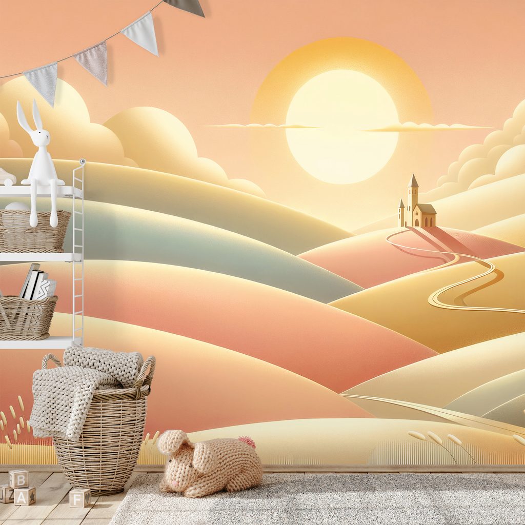 Die pastellene Landschaft mit der Kirche bringt eine ruhige und harmonische Atmosphäre in Ihr Interieur. Die sanften Pastellfarben schaffen einen angenehmen Kontrast zur dominierenden Sonne, die die malerische Landschaft erhellt. Die Tapete evoziert ein Gefühl von Wohlbefinden und Gemütlichkeit, ideal für Wohnzimmer oder Schlafzimmer. Dank der selbstklebenden Oberfläche lässt sie sich mühelos anbringen, was sie zur perfekten Wahl für eine schnelle und effektive Veränderung des Raumlooks macht. Die Qualität des Materials garantiert eine lange Lebensdauer und einfache Pflege.