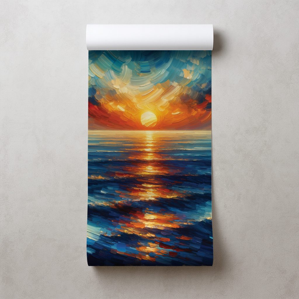 Die Fototapete zeigt einen dramatischen Sonnenuntergang über dem Ozean, der eine atemberaubende Atmosphäre schafft. Auf dem Bild verschmelzen lebendige Farben von Orange, Blau und Violett, die ein Gefühl von Ruhe und einem wunderschönen Abend hervorrufen. Die Oberfläche des Ozeans schimmert in goldenen und blauen Nuancen, was das allgemeine Wohlbefinden verstärkt. Diese Tapete ist ideal für Wohnzimmer oder Schlafzimmer, wo sie den Räumen einen Hauch von Eleganz und Romantik verleiht. Hergestellt aus hochwertigen Materialien, garantiert sie eine lange Lebensdauer und eine einfache Anbringung.
