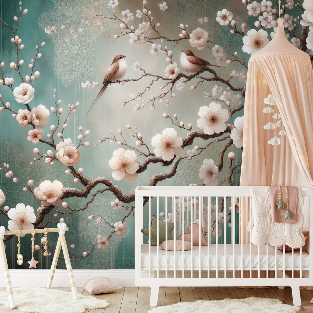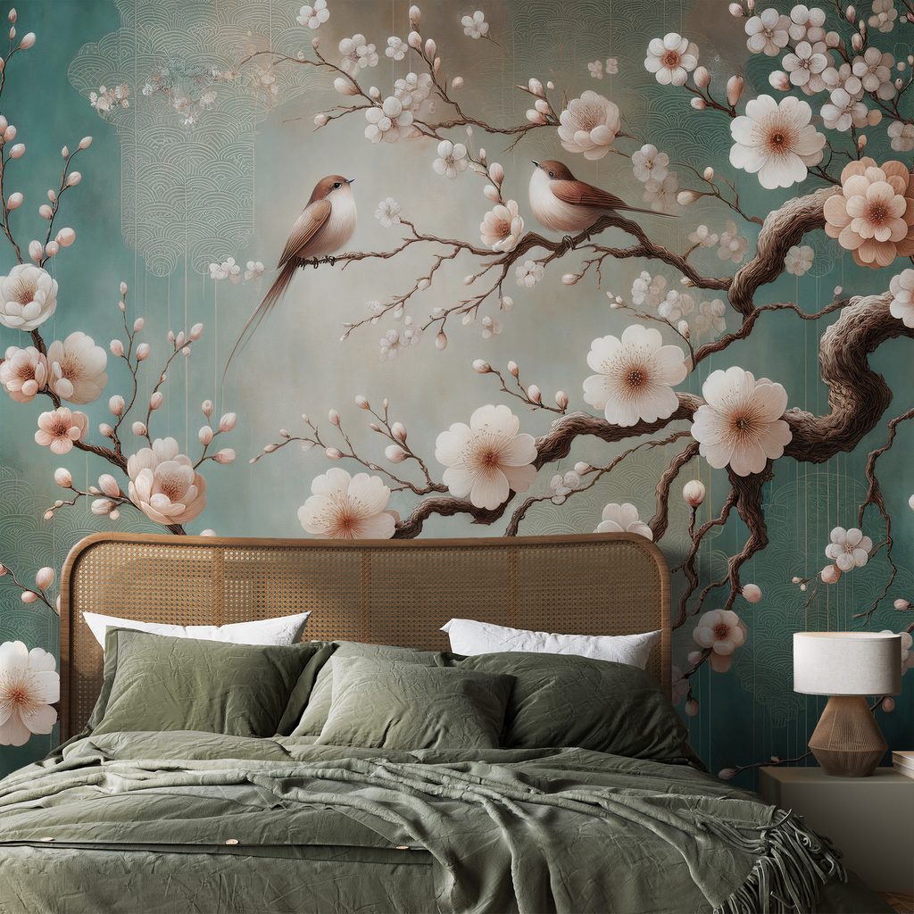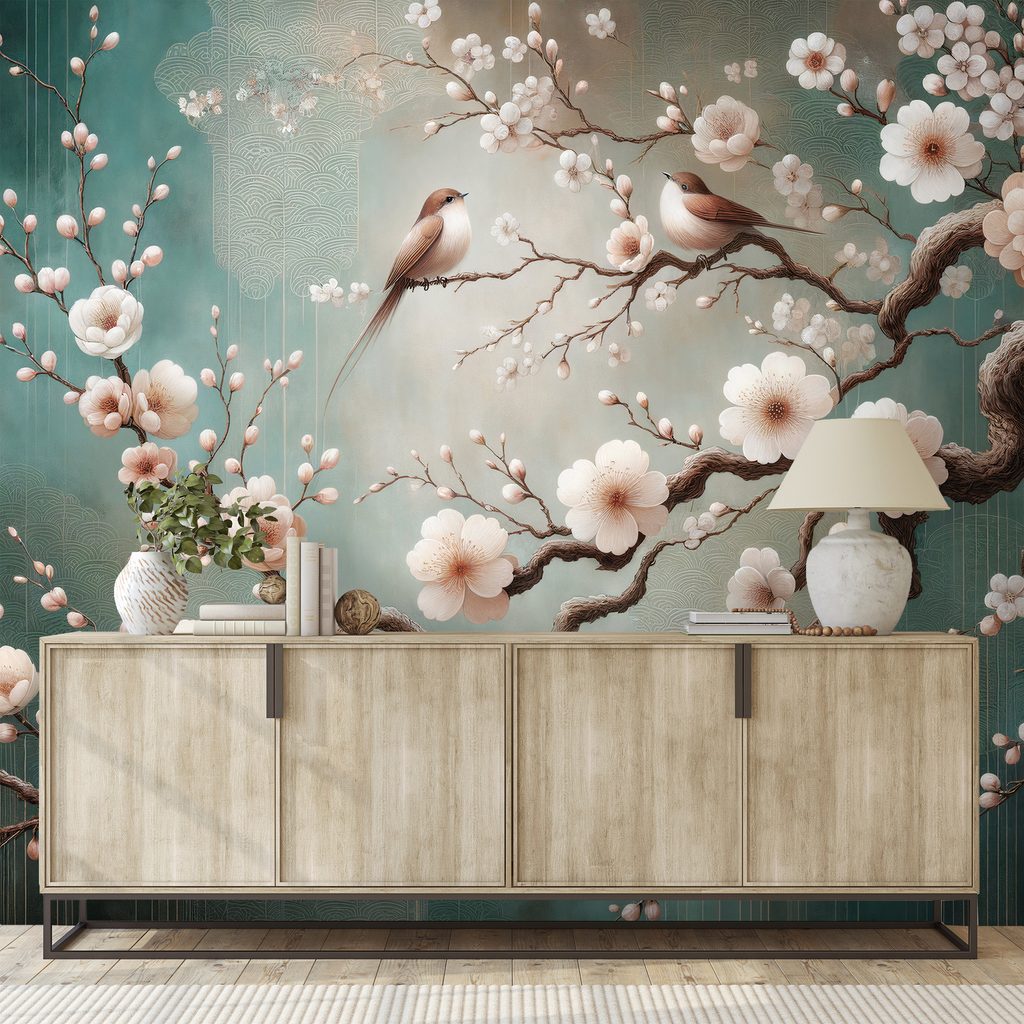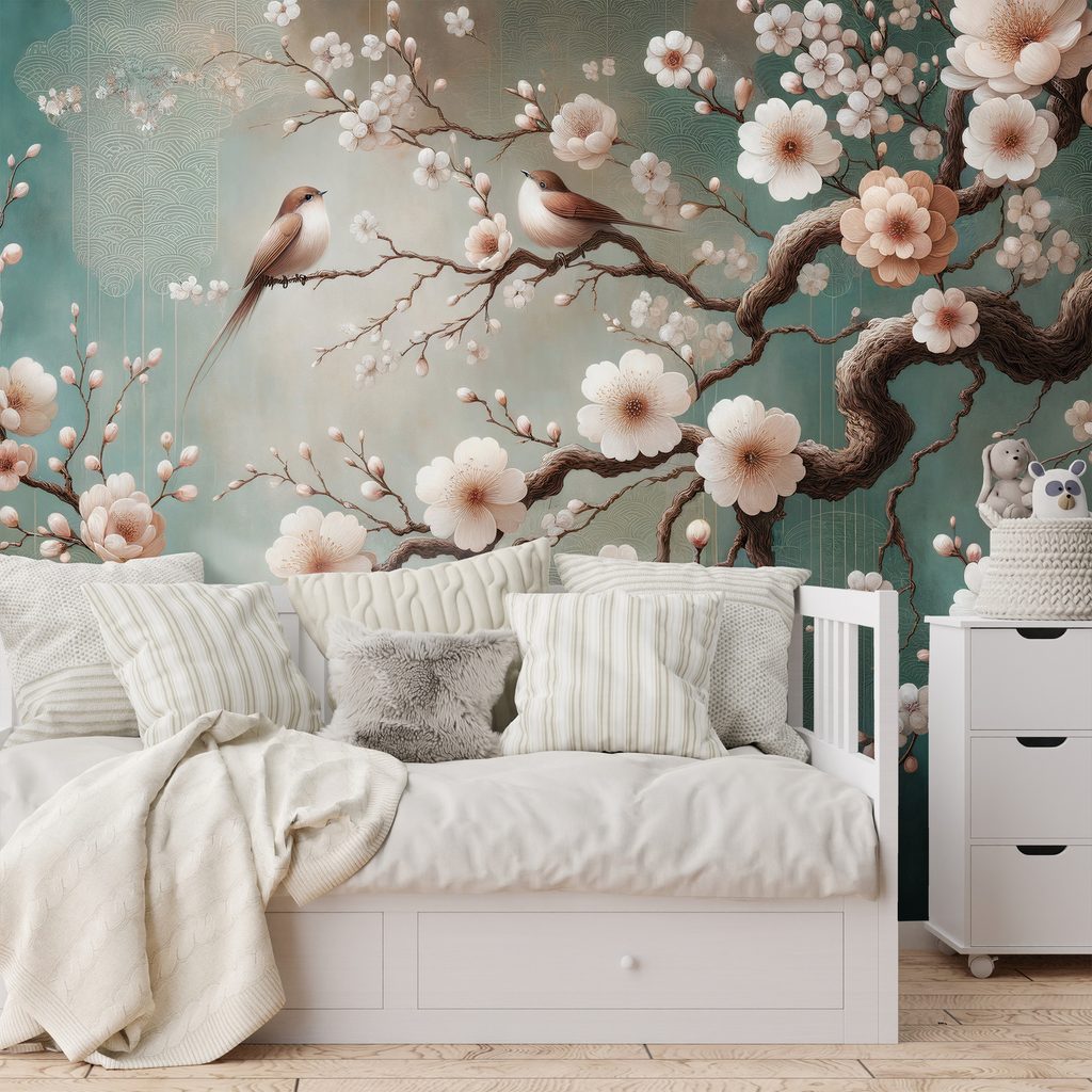Die Tapete mit zarten Blumen und Vögeln auf Ästen bringt einen Hauch von Natur und Eleganz in Ihr Zuhause. Das Motiv besticht durch frische florale Details und zwei Vögel, die auf den Ästen sitzen und eine harmonische Komposition bilden. Die Farbpalette in sanften Pastelltönen verleiht dem Raum eine ruhige und gemütliche Atmosphäre. Ideal für das Wohnzimmer, das Schlafzimmer oder das Arbeitszimmer, wo Sie die natürliche Inspiration schätzen werden. Die Qualität der Tapete garantiert Langlebigkeit und eine einfache Anbringung an der Wand.