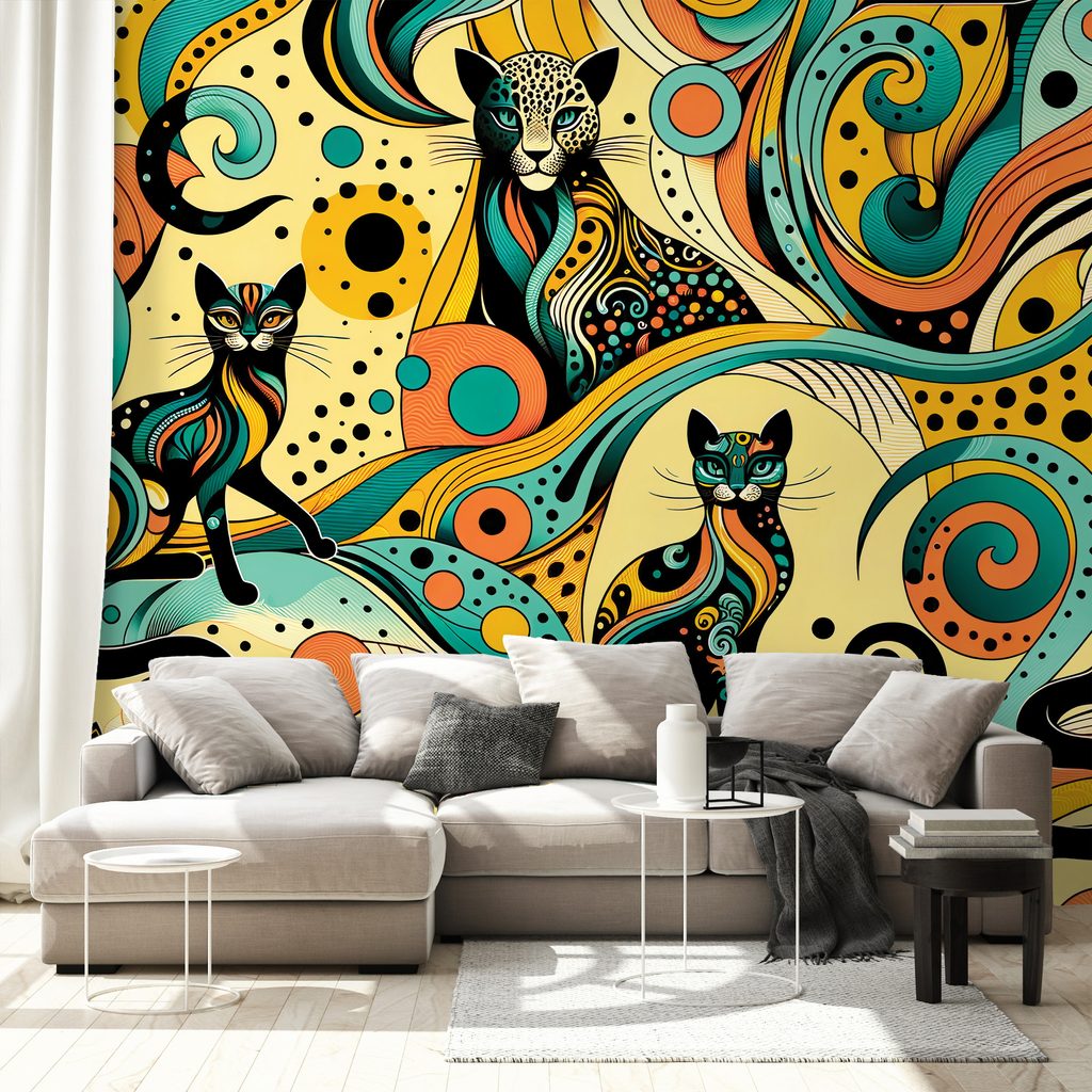 Die bunte abstrakte Katze ist das Hauptmotiv dieser selbstklebenden Fototapete, die Ihrem Interieur Spielfreude und Originalität verleiht. Die Katzenmuster sind von dynamischen Wellen und bunten Kreisen umgeben, die eine lebendige Komposition schaffen. Die Kombination aus satten Farben wie Schwarz, Blau, Orange und Gelb verleiht der Tapete eine energiegeladene und fröhliche Atmosphäre. Ideal geeignet, um Kinderzimmer, Spielbereiche oder kreative Ecken aufzupeppen. Das hochwertige Material sorgt für eine einfache Anwendung und eine lange Lebensdauer.