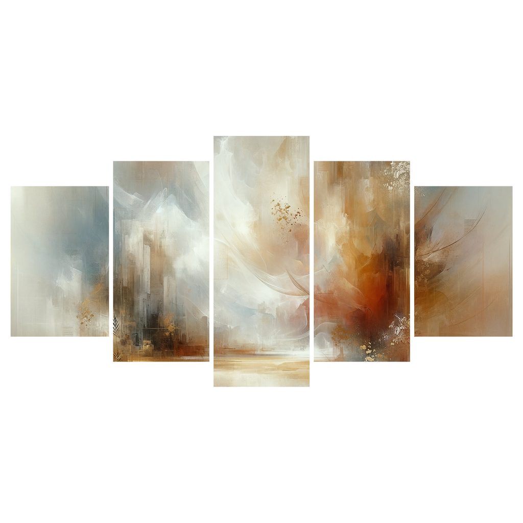 Abstraktes 5-teiliges Wandbild mit warmen Farben bringt eine einzigartige Atmosphäre in Ihr Zuhause. Die Kombination aus sanften Beige-, Braun- und Goldtönen vermischt sich mit Anklängen an abstrakte Formen, was dem Kunstwerk Dynamik und Tiefe verleiht. Lichtspiele und elegante Details schaffen ein Gefühl von Wärme und Gemütlichkeit. Dieses Wandbild ist die ideale Wahl für Wohn- und Schlafzimmer sowie Büros, wo Sie seine Ästhetik und Harmonie zu schätzen wissen. Hergestellt aus hochwertigen Materialien garantiert es Langlebigkeit und Farbbeständigkeit.