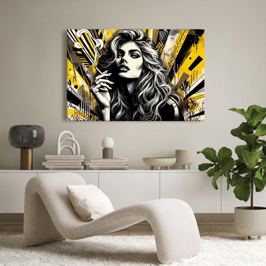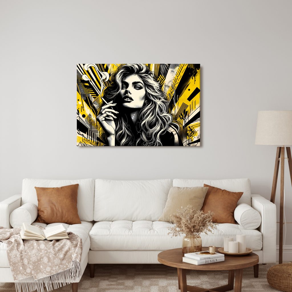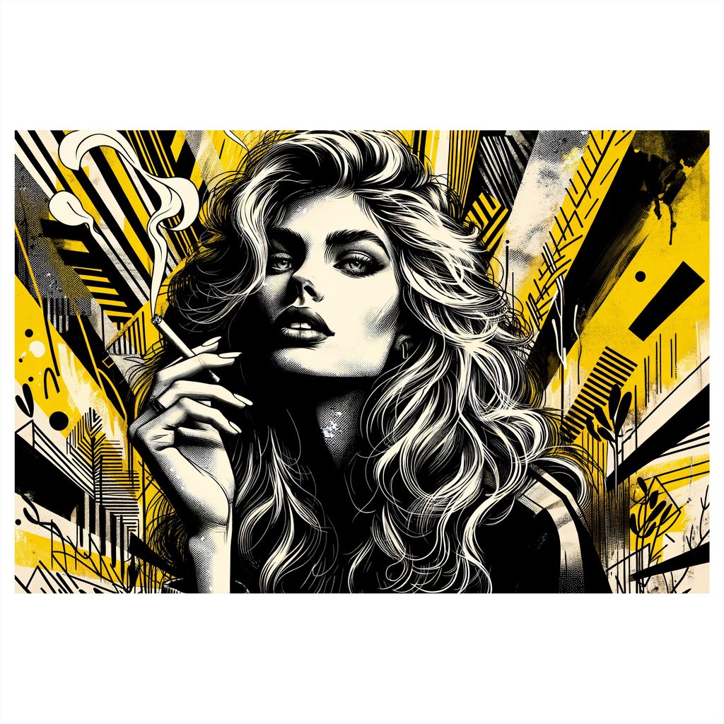Das Wandbild zeigt eine Frau im modernen Stil mit einem markanten und charismatischen Aussehen. Details wie der Rauch einer Zigarette und dynamische geometrische Muster verleihen der Komposition eine einzigartige Note. Die dominierenden Farben Gelb und Schwarz schaffen eine energiegeladene und stilvolle Atmosphäre. Dieses Wandbild passt hervorragend in moderne Interiors, wo es die Individualität und Kreativität des Raumes unterstreicht. Die Druckqualität garantiert eine lange Lebensdauer und Lebhaftigkeit der Farben, die jede Wand zum Leben erwecken.
