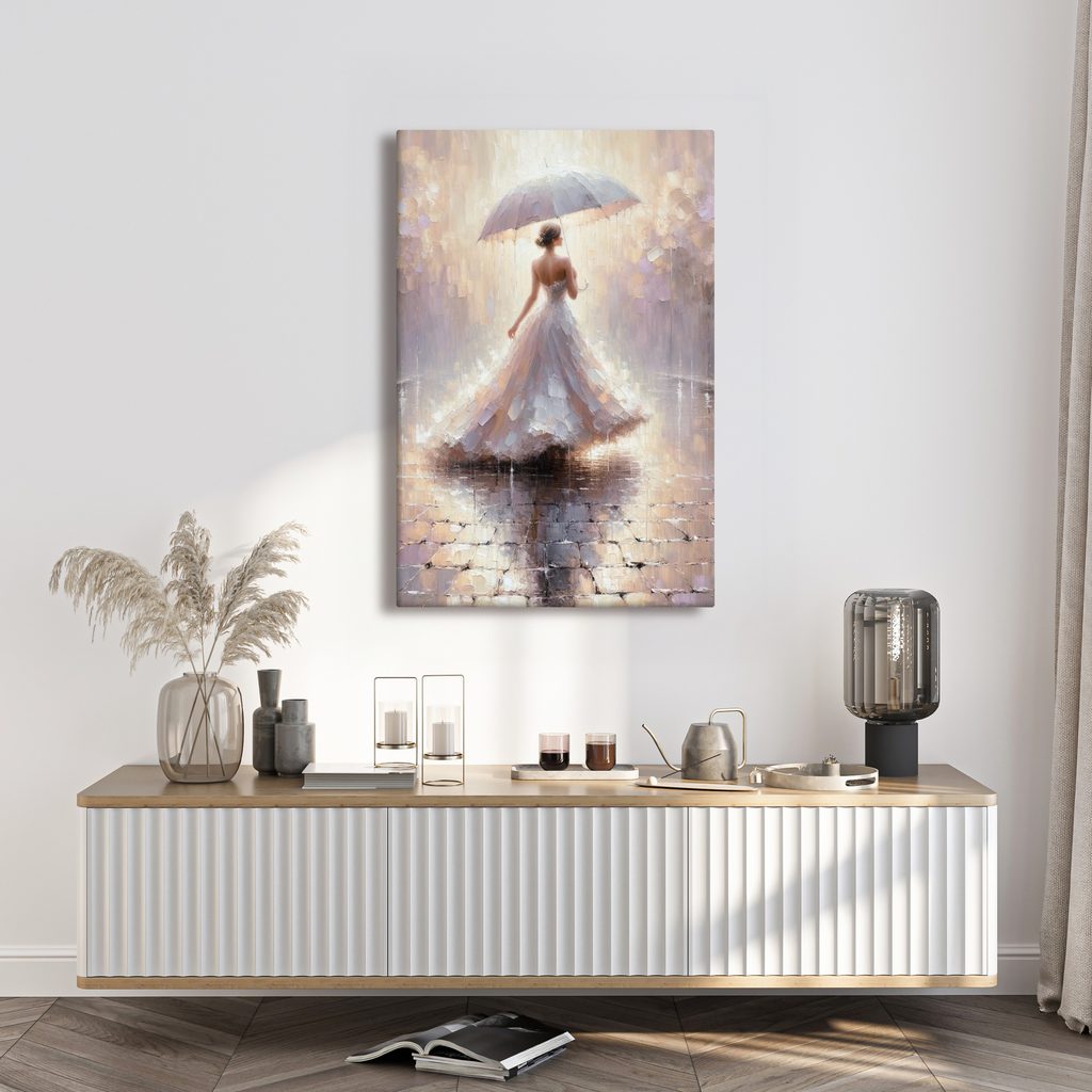 Das Wandbild zeigt eine elegante Frau mit einem Regenschirm im Regen, die Zartheit und Romantik ausstrahlt. Details wie der fließende Rock und sanfte Farben schaffen eine wunderbare Atmosphäre. Die Palette pastellfarbener Töne verleiht dem Werk eine ruhige und traumhafte Stimmung, die jeden Innenraum erfrischt. Dieses Wandbild ist die ideale Wahl für das Wohnzimmer oder das Schlafzimmer, wo es einen zauberhaften Akzent setzt. Die Druckqualität und das Material garantieren Langlebigkeit und Schönheit an Ihren Wänden.