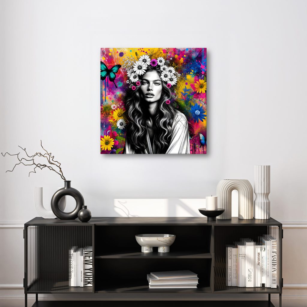 Das Wandbild eines Mädchens mit Schmetterlingen und Blumen bringt eine lebendige Atmosphäre der Natur in Ihr Zuhause. Die Hauptfigur ist von bunten Blumen und farbenfrohen Schmetterlingen umgeben, was einen harmonischen Kontrast zu ihrem eleganten Erscheinungsbild schafft. Klare und satte Farben dominieren und strahlen Freude und positive Energie aus. Dieses Wandbild ist ideal, um Ihr Wohnzimmer oder Schlafzimmer aufzufrischen und dem Raum einen frischen und optimistischen Touch zu verleihen. Hergestellt aus hochwertigen Materialien garantiert es Langlebigkeit und Farbtreue.