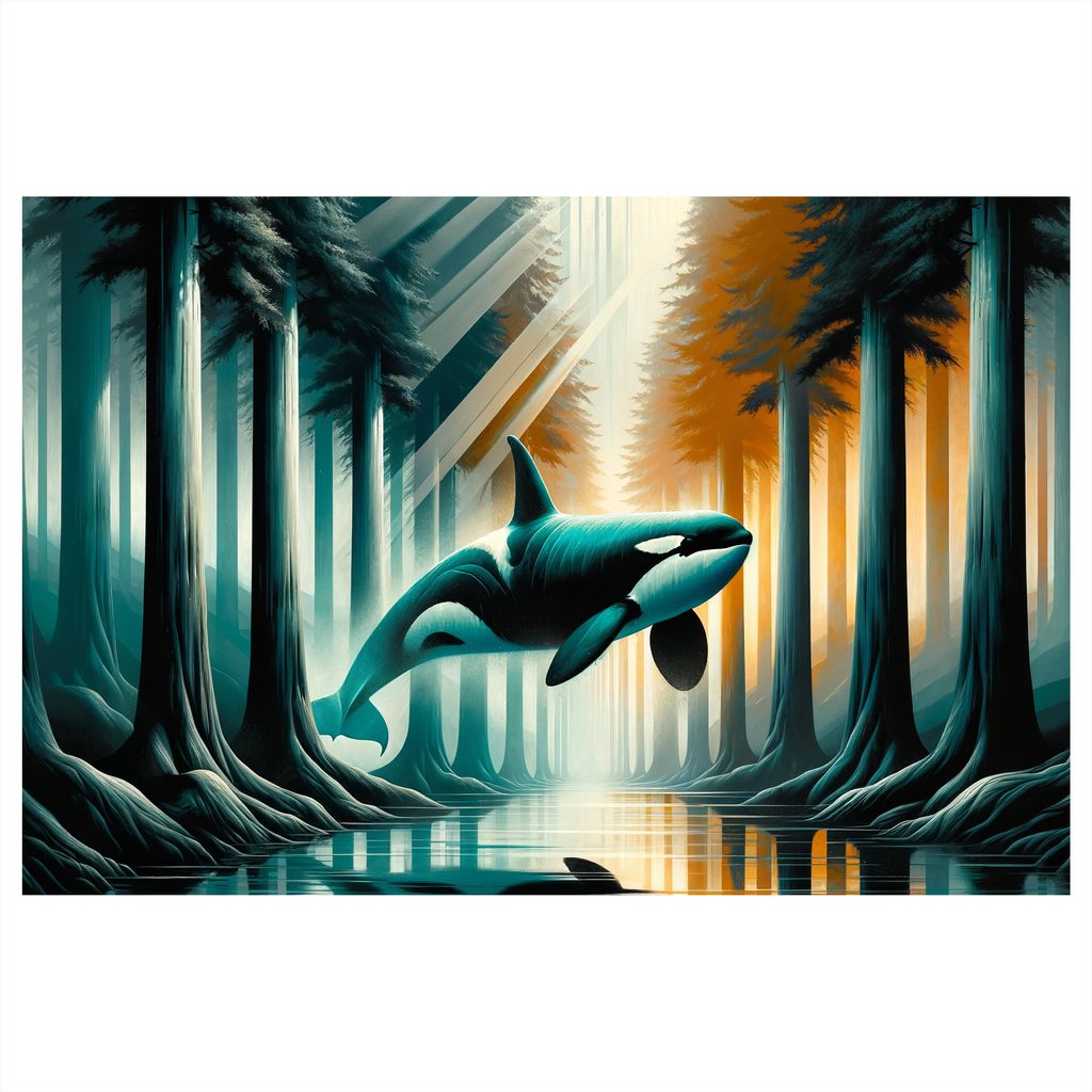 Das Wandbild "Iristraum" fängt den majestätischen Orca ein, der über die ruhige Wasseroberfläche des Waldes springt. Im Hintergrund ragen hohe Bäume empor, die eine mystische Atmosphäre schaffen, während sanfte Lichtstrahlen durch die Zweige scheinen. Dunkle und blaue Farbtöne dominieren, ergänzt durch warme Orangetöne, die dem Bild Tiefe und Dynamik verleihen. Dieses Wandbild ist ideal, um Ihr Interieur zu beleben und bringt ein Gefühl von Ruhe und Harmonie in Ihren Raum. Hochwertige Materialien gewährleisten eine lange Lebensdauer und Farbbeständigkeit.