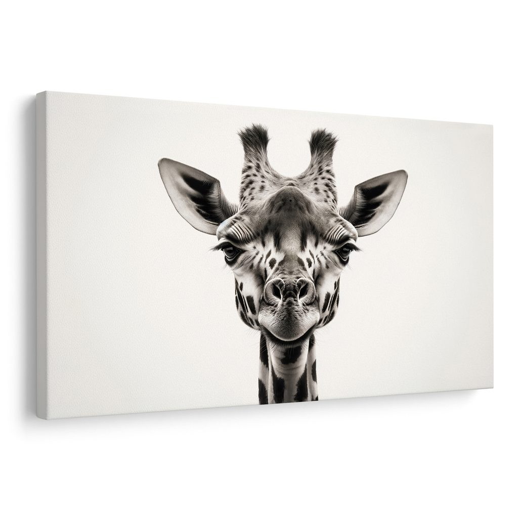 Das Wandbild zeigt ein Porträt einer Giraffe mit detaillierter Darstellung ihres Gesichts. Auf der Leinwand sind feine Details des Fells und markante Merkmale zu erkennen, die einen realistischen Eindruck vermitteln. Die Farbgestaltung in Grautönen und Weiß verleiht dem Bild eine elegante und moderne Atmosphäre. Dieses einzigartige Stück ist ideal für Naturliebhaber und kann jeden Innenraum beleben. Die Druckqualität sorgt für Langlebigkeit und eine ansprechende Optik, die jeden Besucher erfreuen wird.